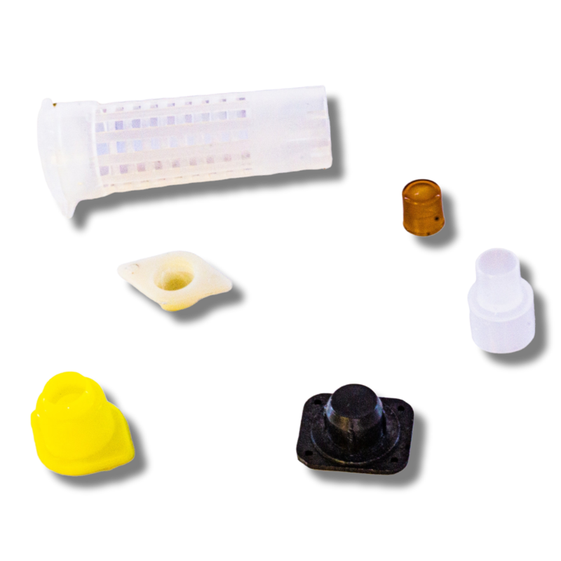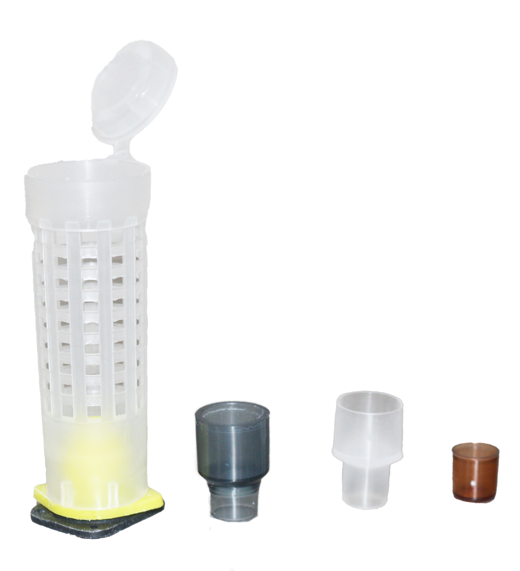 El kit, está formado por 5 piezas que son: la base/soporte bloc NICOT® (color negro); el bloc portacúpulas (color amarillo) y encaja perfectamente en la base; la jaula redonda tipo rulero (transparente) y las cúpulas (pueden ser de color transparente o café).