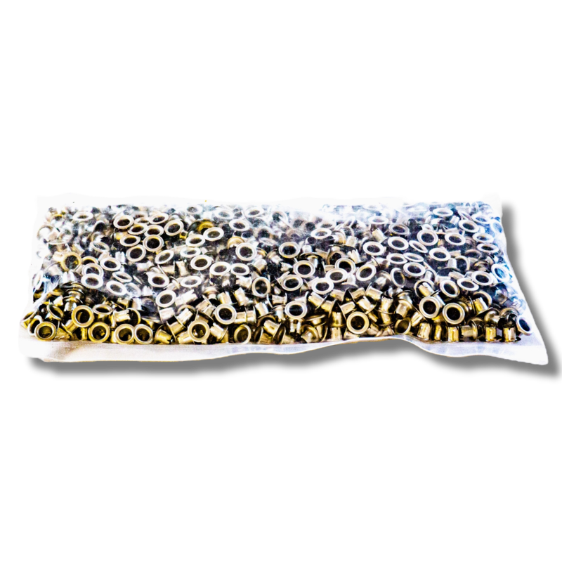 Los ojalillos u ojales metálicos se utilizan para reforzar los cuadros y evitar así que los alambres se aflojen con el paso del tiempo. Estos van colocados en los agujeros donde pasa el alambre, de tal manera de que, si el agujero no es lo suficientemente grande para el ojalillo, se deberá taladrar previamente con la lezna manual o mecanizada. Diámetro del tubo del ojalillo 2.90mm, la que va dentro del cuadro. La bolsa contiene ojalillos.